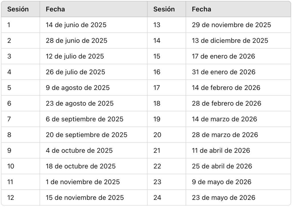 - Frecuencia de las clases: un sábado cada quince días.